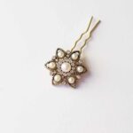 Horquilla de estrella de metal en oro viejo con cristales y perlas. Las perlas son la tendencia de esta temporada 2023 y esta estrella es una forma perfecta de llevarla de una forma muy actual., y decorar tu coleta o recogido. También puedes llevarla a un lado con el pelo suelto.