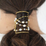 Coletero realizado con hilo de latón, con una estructura rígida, pero abierta y que permite cierto grado de adaptación. Está, además adornada con perlas y cristales, dándole un aire muy actual.