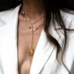 Collar doble de 37 cm de largo, de cadena de eslabones grandes, de acero inoxidable en color dorado. Lleva intercaladas perlas y cristales en gris humo y va rematado con una estrella de latón bañada en oro con cristal en gris humo.