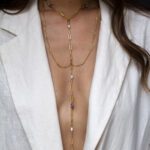 Collar de cadenas de 48 cm de largo. Eslabones largos con perlas y cristales salteados, combinado con cadena fina y rematado con una estrella con cristales en rosa viejo.