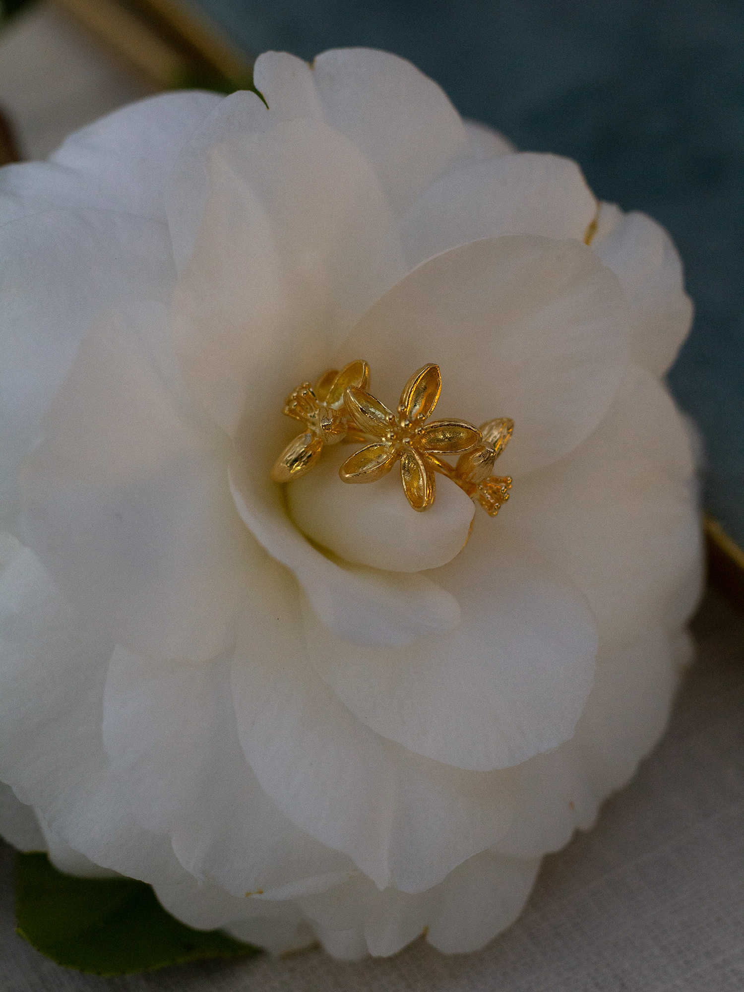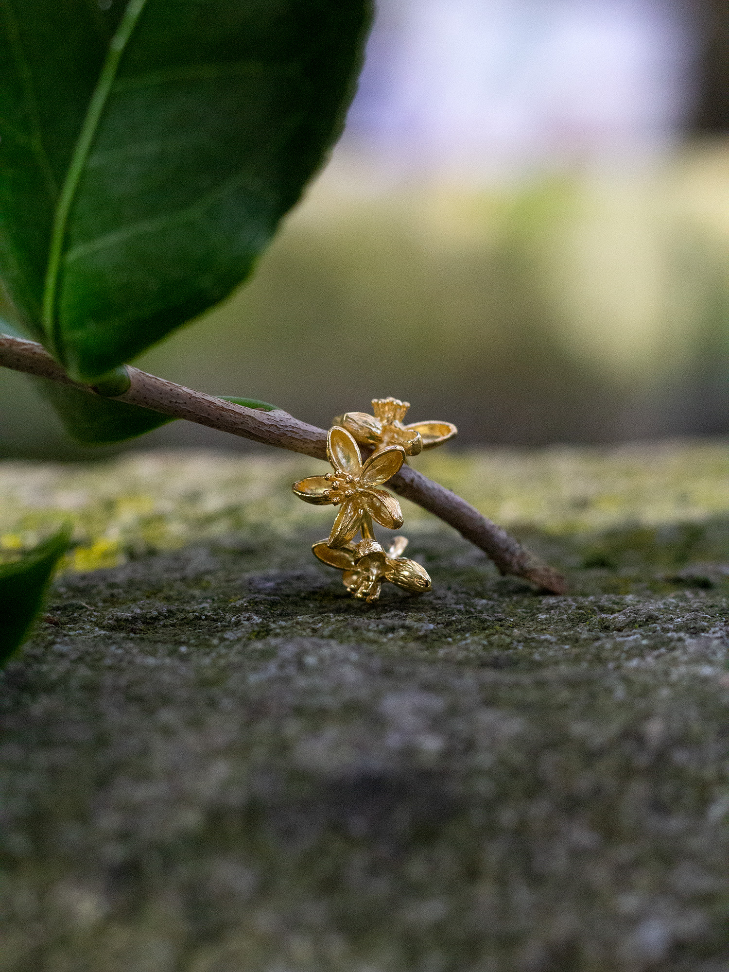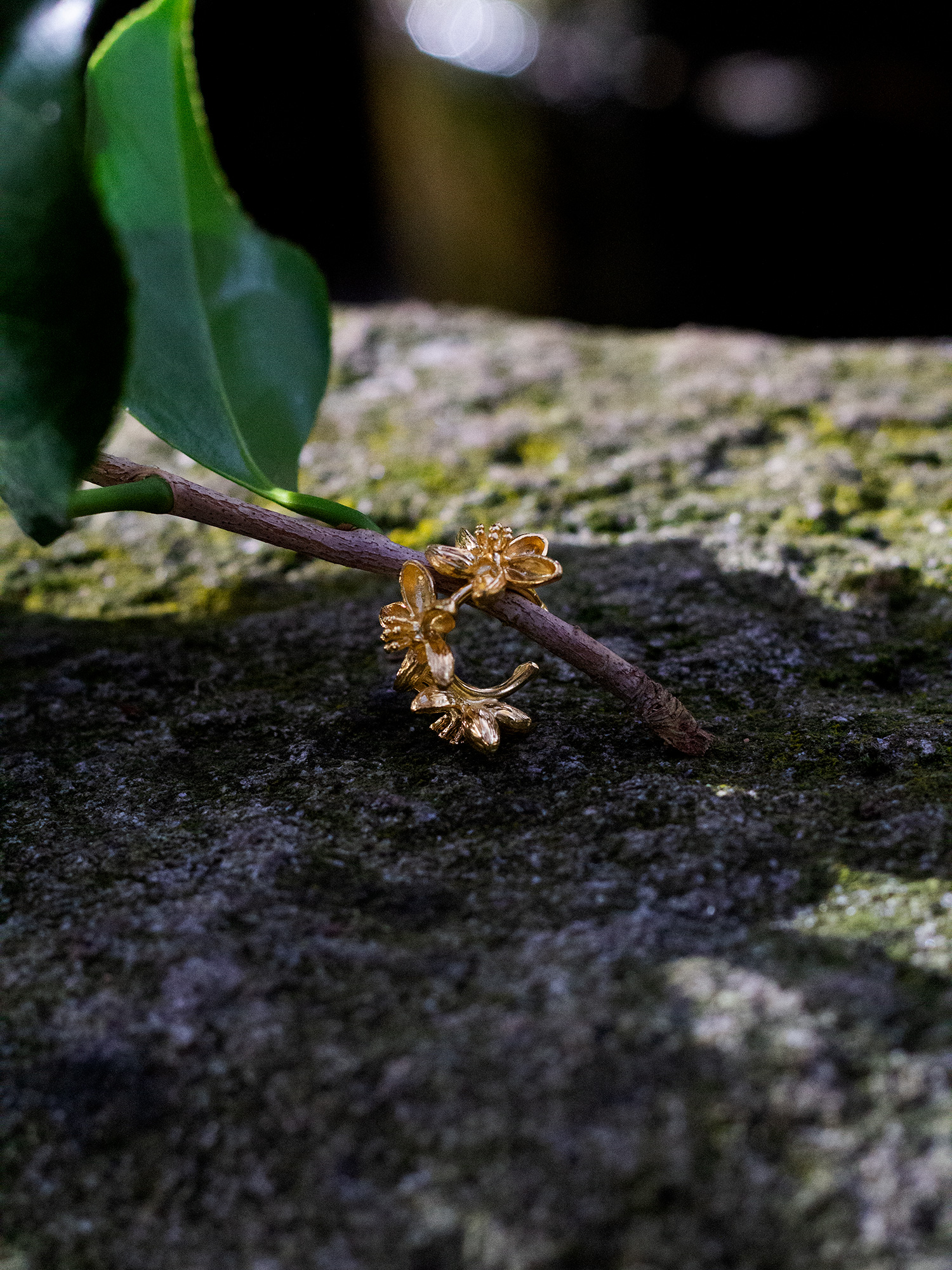 Earcuff formado por un arito pequeño con tres flores mini. Está hecho en latón y lleva un baño en oro de 18 kilates de 2 micras.