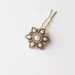 Horquilla de estrella de metal en oro viejo con cristales y perlas. Las perlas son la tendencia de esta temporada 2023 y esta estrella es una forma perfecta de llevarla de una forma muy actual., y decorar tu coleta o recogido. También puedes llevarla a un lado con el pelo suelto.