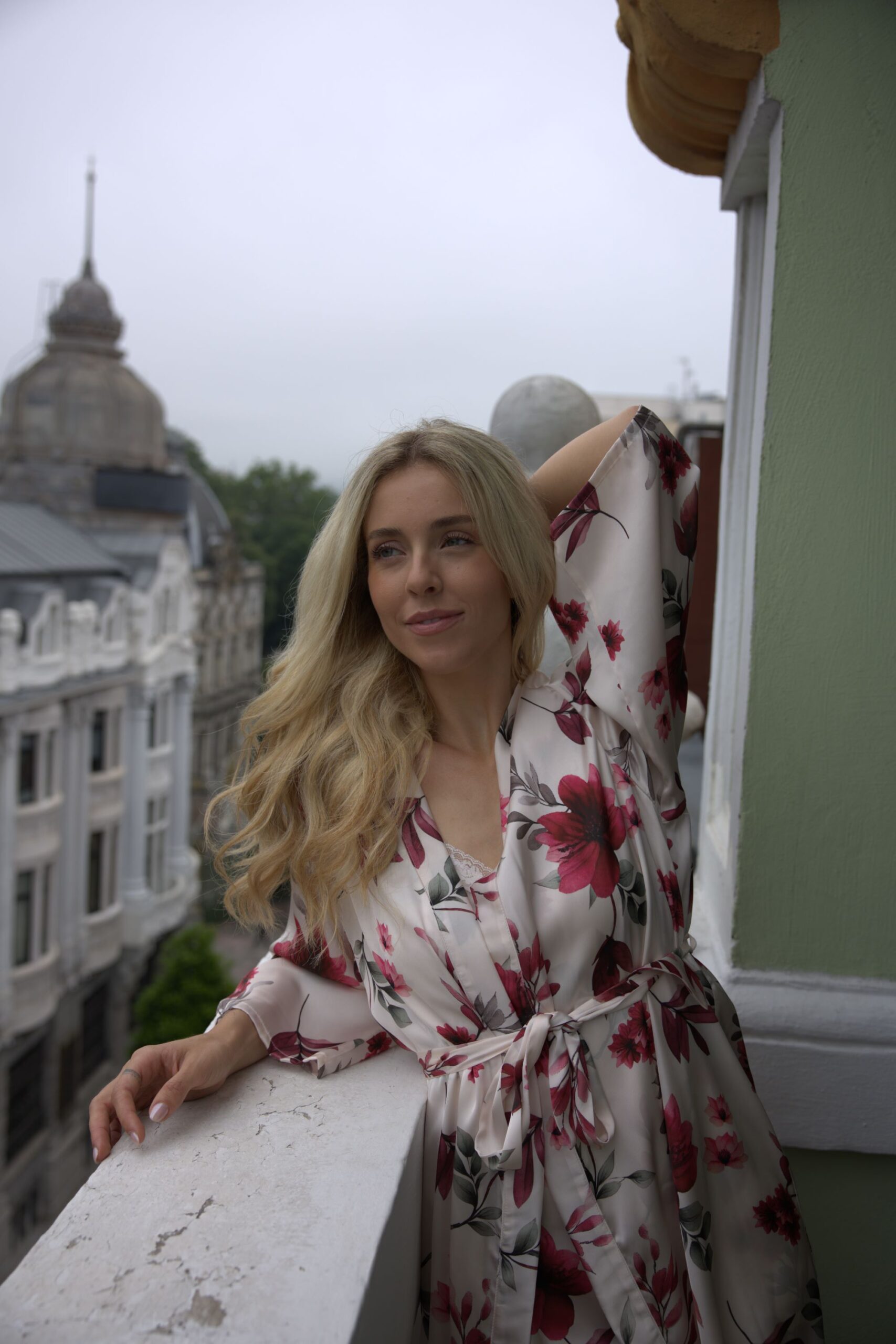 El Kimono Toscana es una oda a la calidez y al diseño atemporal. Confeccionado en un exquisito tejido de piel de ángel, esta pieza destaca por un estampado de flores de gran formato en profundos tonos granate que contrastan con un sereno fondo color arena. Es la prenda soñada para acompañar el ritual de tus preparativos, aportando una sofisticación orgánica y una luz especial a cada fotografía mientras te sumerges en la magia del peinado y el maquillaje.