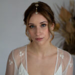 Cubrerraiz de 26 cm de largo, con estrellas y piezas de latón con cristales, para colocar, como su nombre indica, sobre la raya del pelo.
