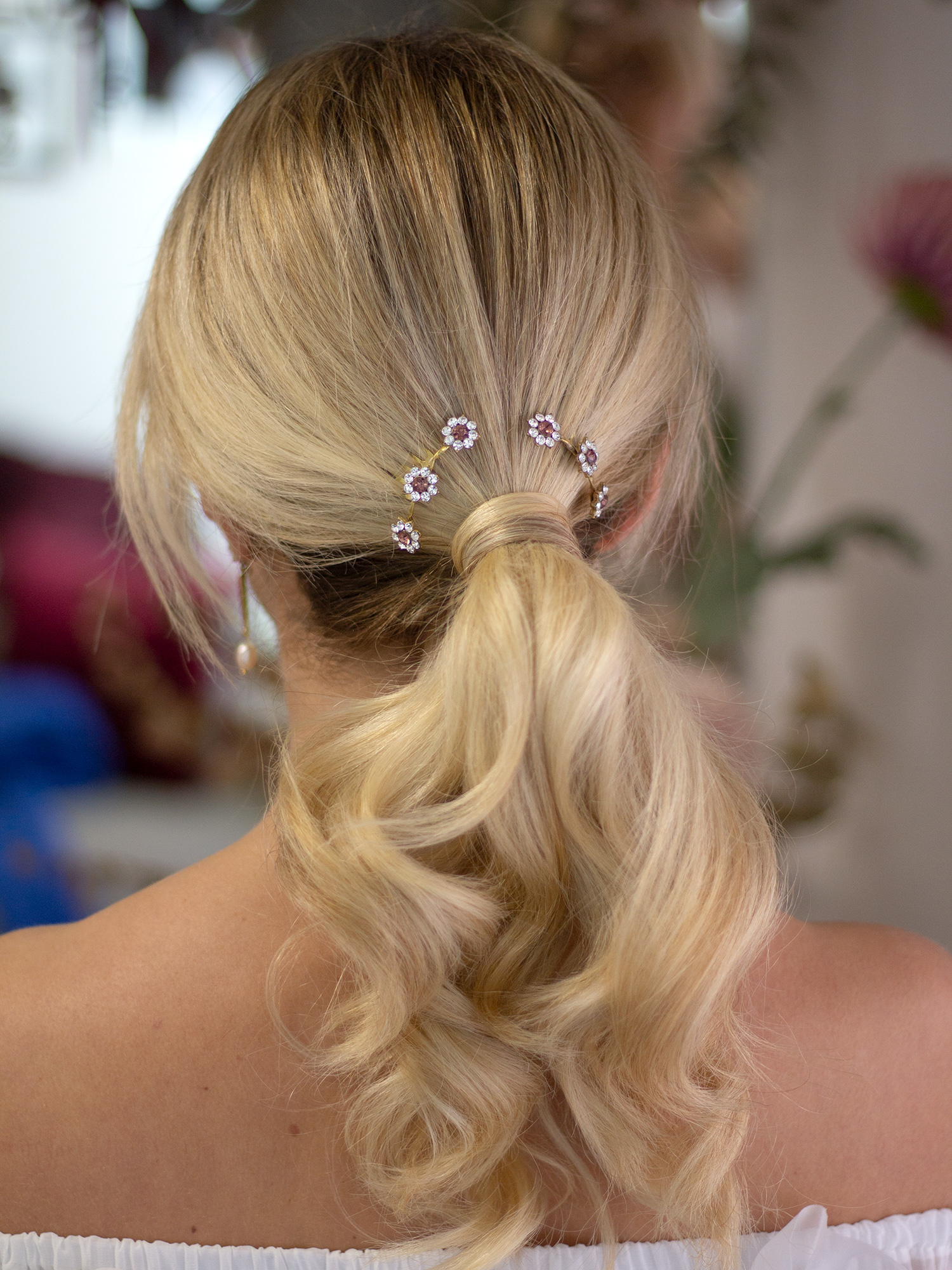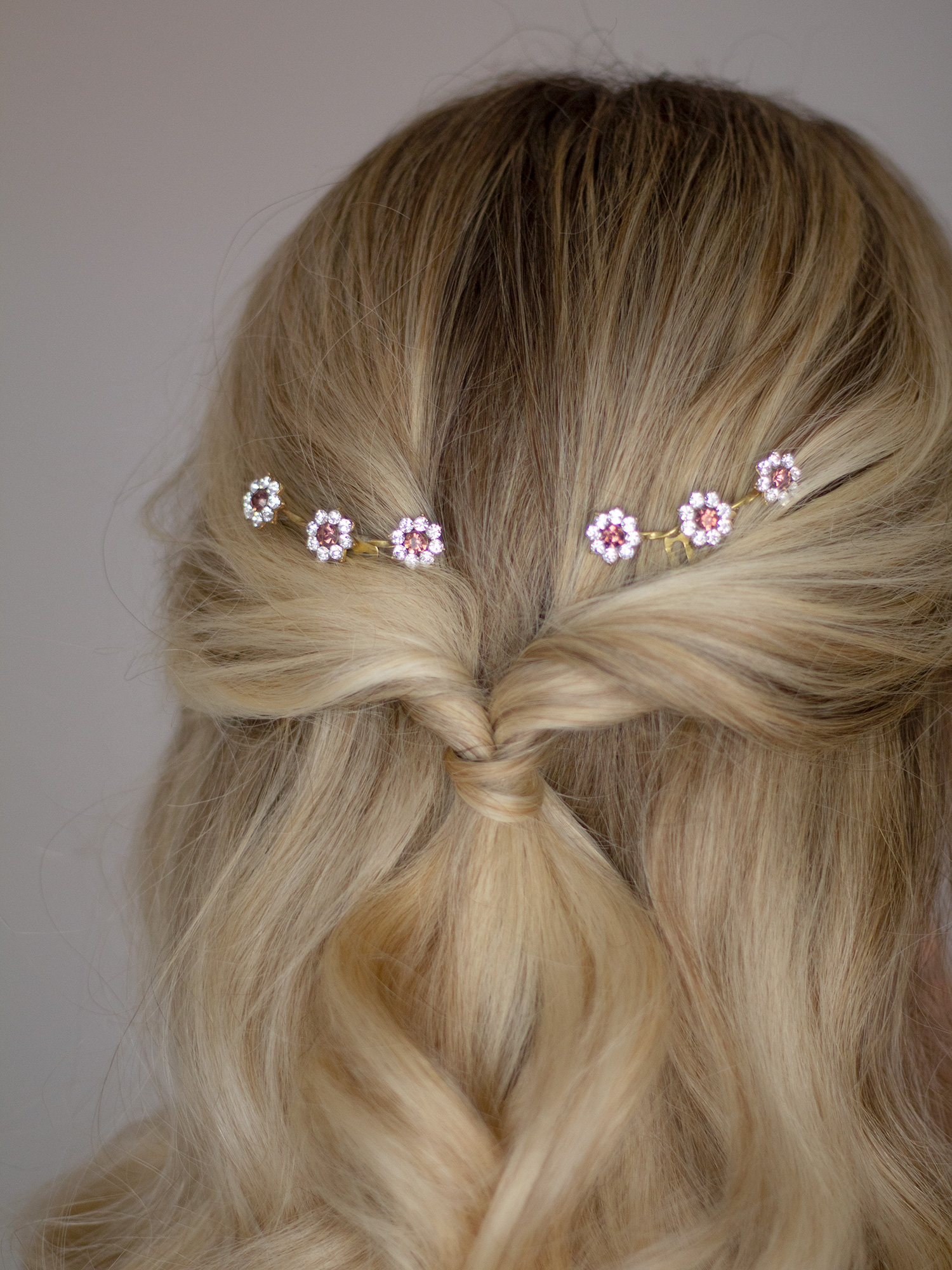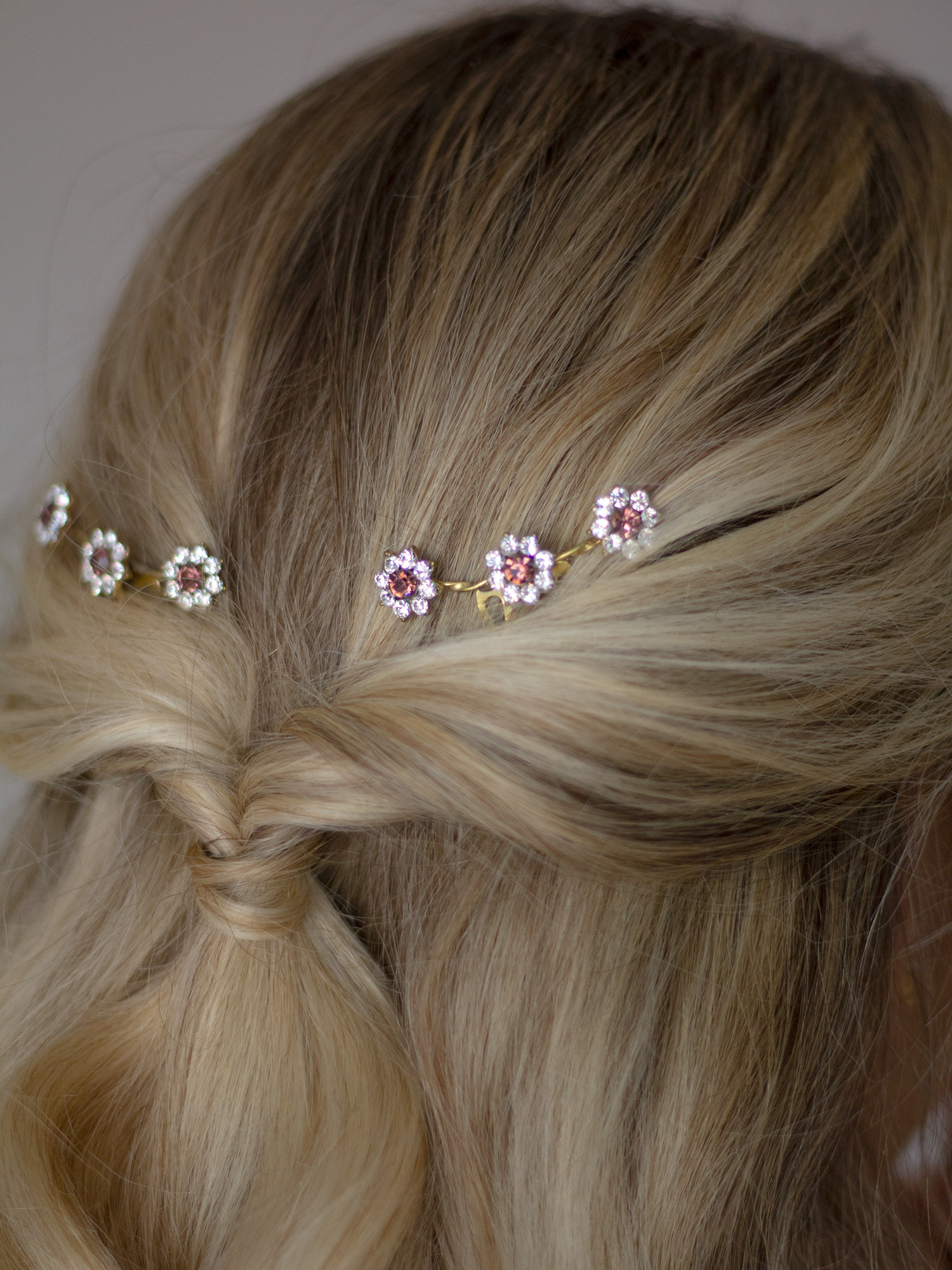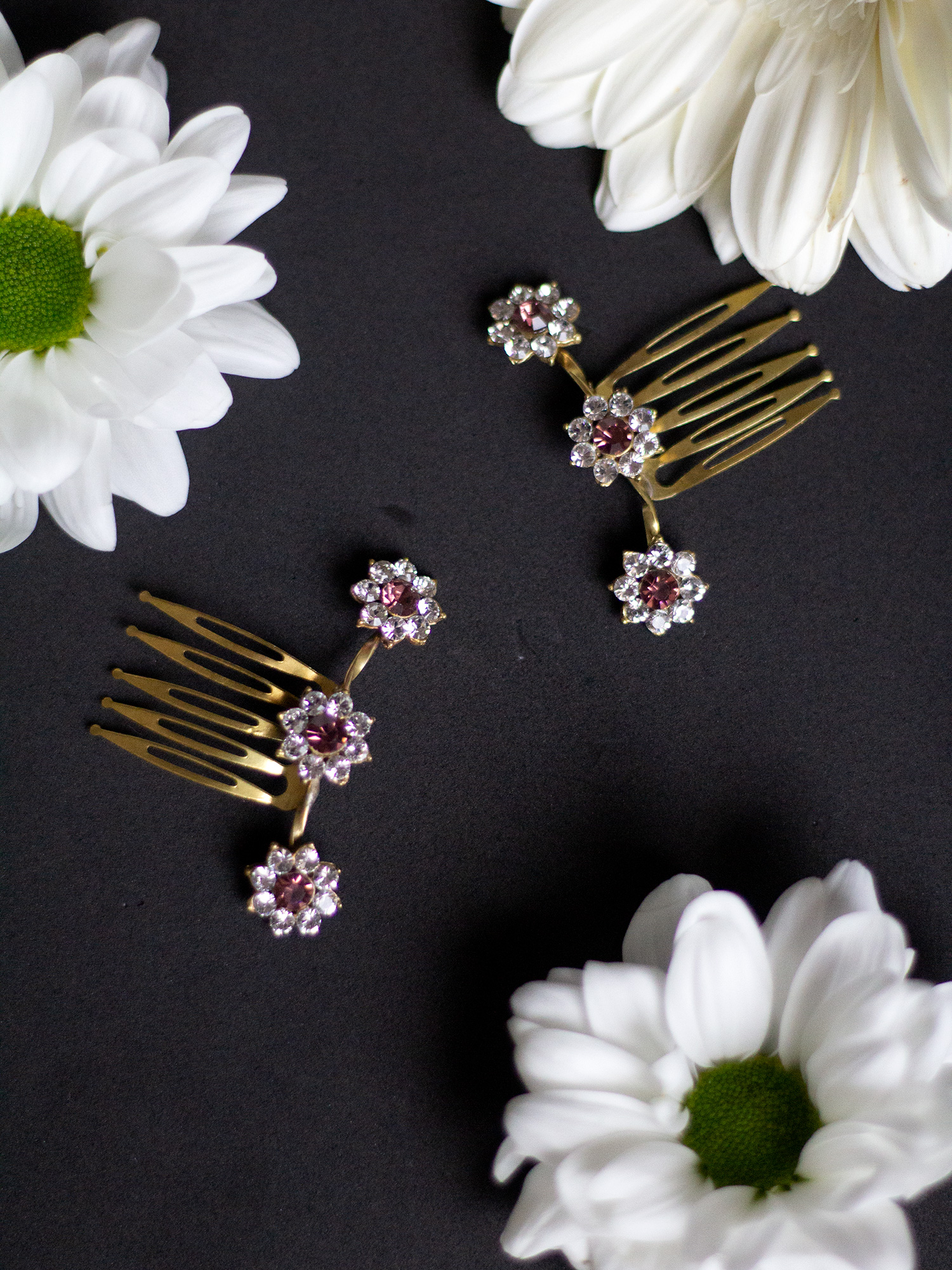 Los flores de esta peineta son pequeñas, pero sus cristales aportan luz y brillo sin resultar exgeradas. Van unidas por hilo de latón retorcido y miden 6 cm.