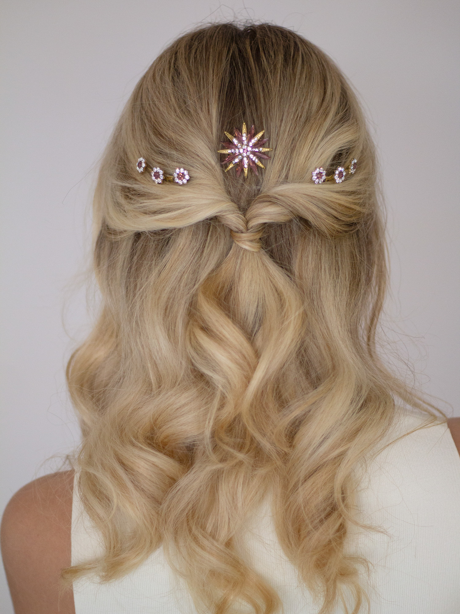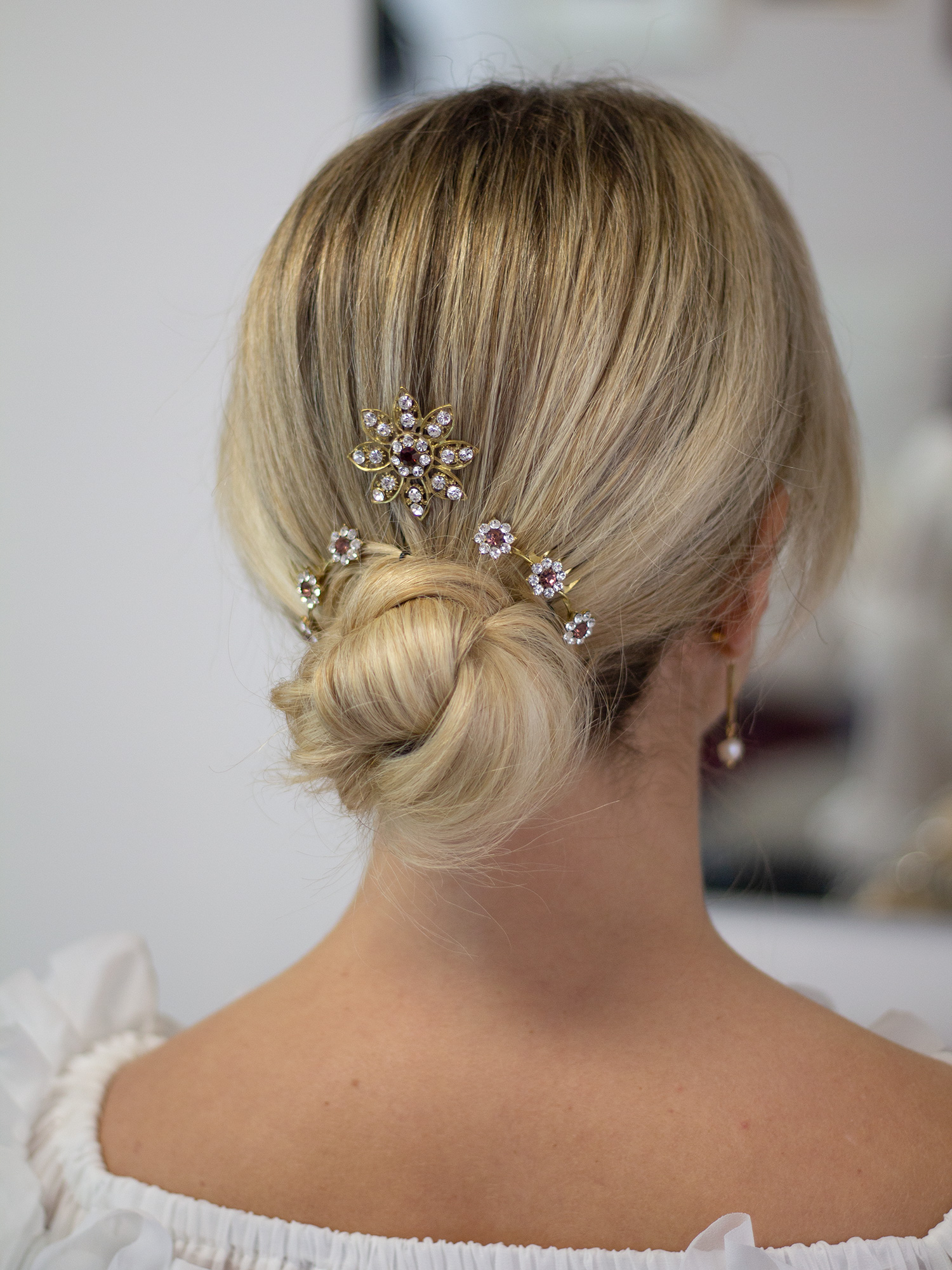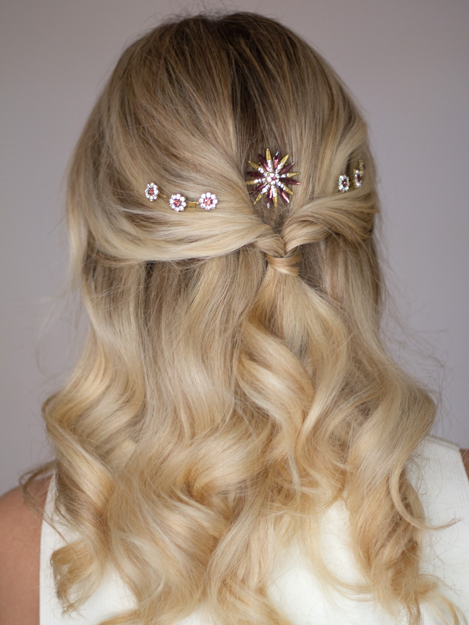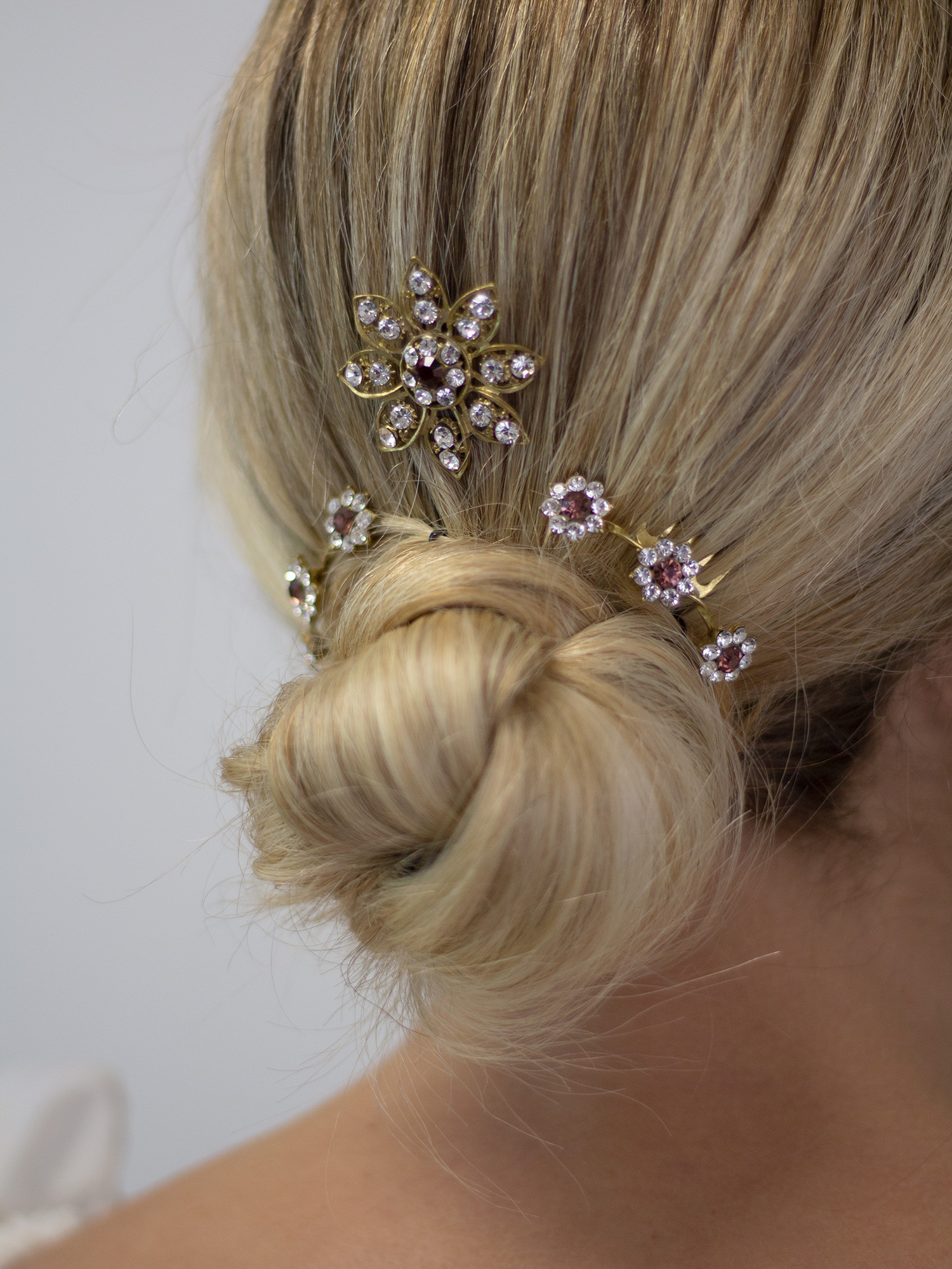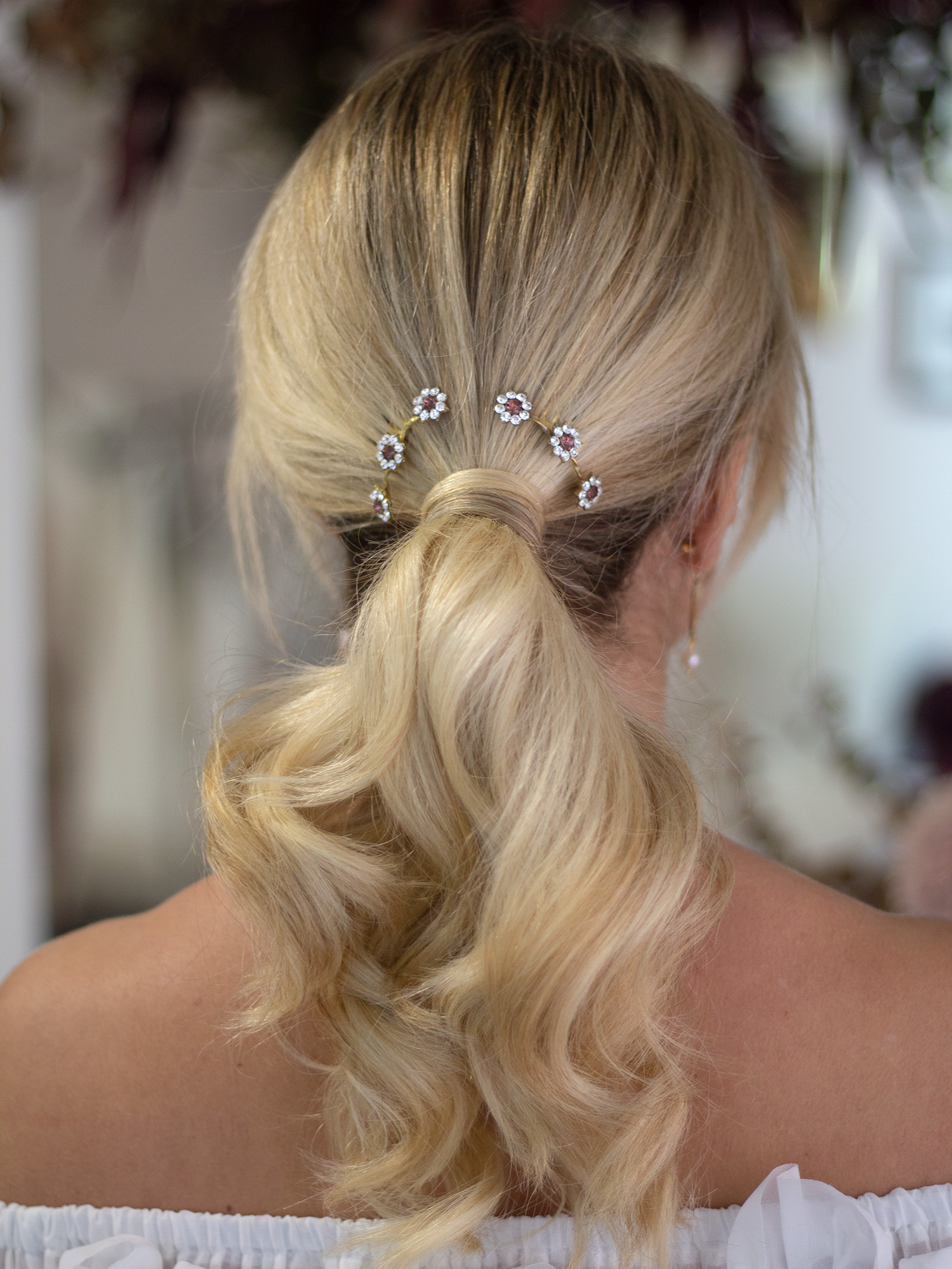Los flores de esta peineta son pequeñas, pero sus cristales aportan luz y brillo sin resultar exgeradas. Van unidas por hilo de latón retorcido y miden 6 cm.