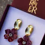 Pendientes con base ondulada en acero inoxidable dorado, de 2,5 cm de largo. Y nuestra flor de porcelana fría más característica en color vino.
