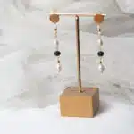 Pendientes con base redonda de acero inox dorado, con cadeneta de perlas mini y piedras en azul noche.