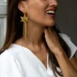 Pendientes largos perfectos para una ocasión especial. La base es redonda y de acero en dorado, de la que cuelga una flor de latón bañada en oro y flecos de metal, que hacen que tenga un largo total de 14 cm.