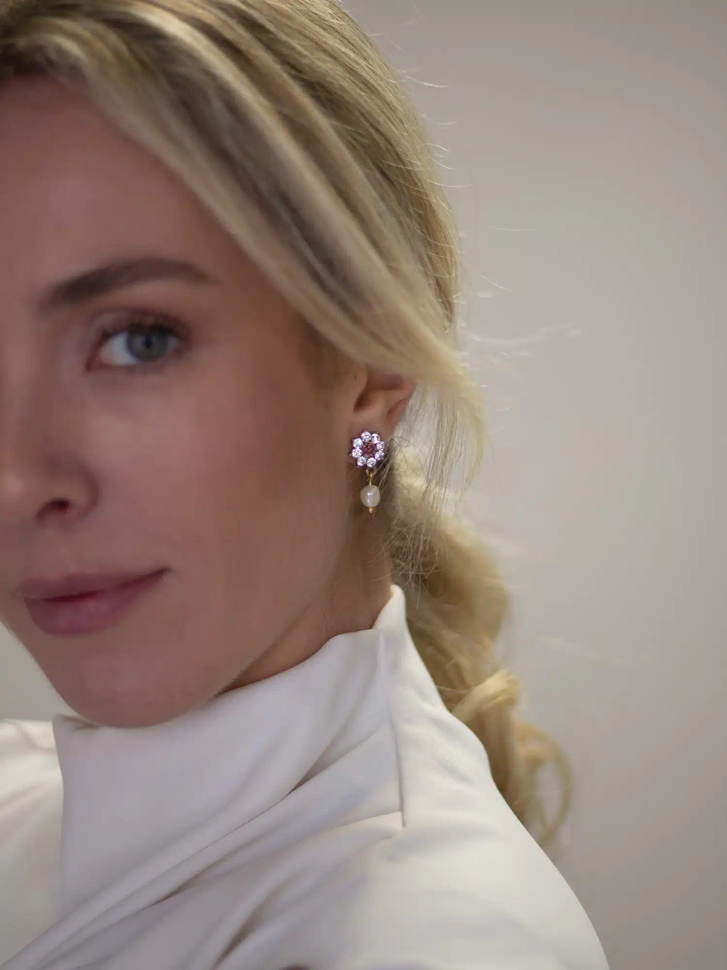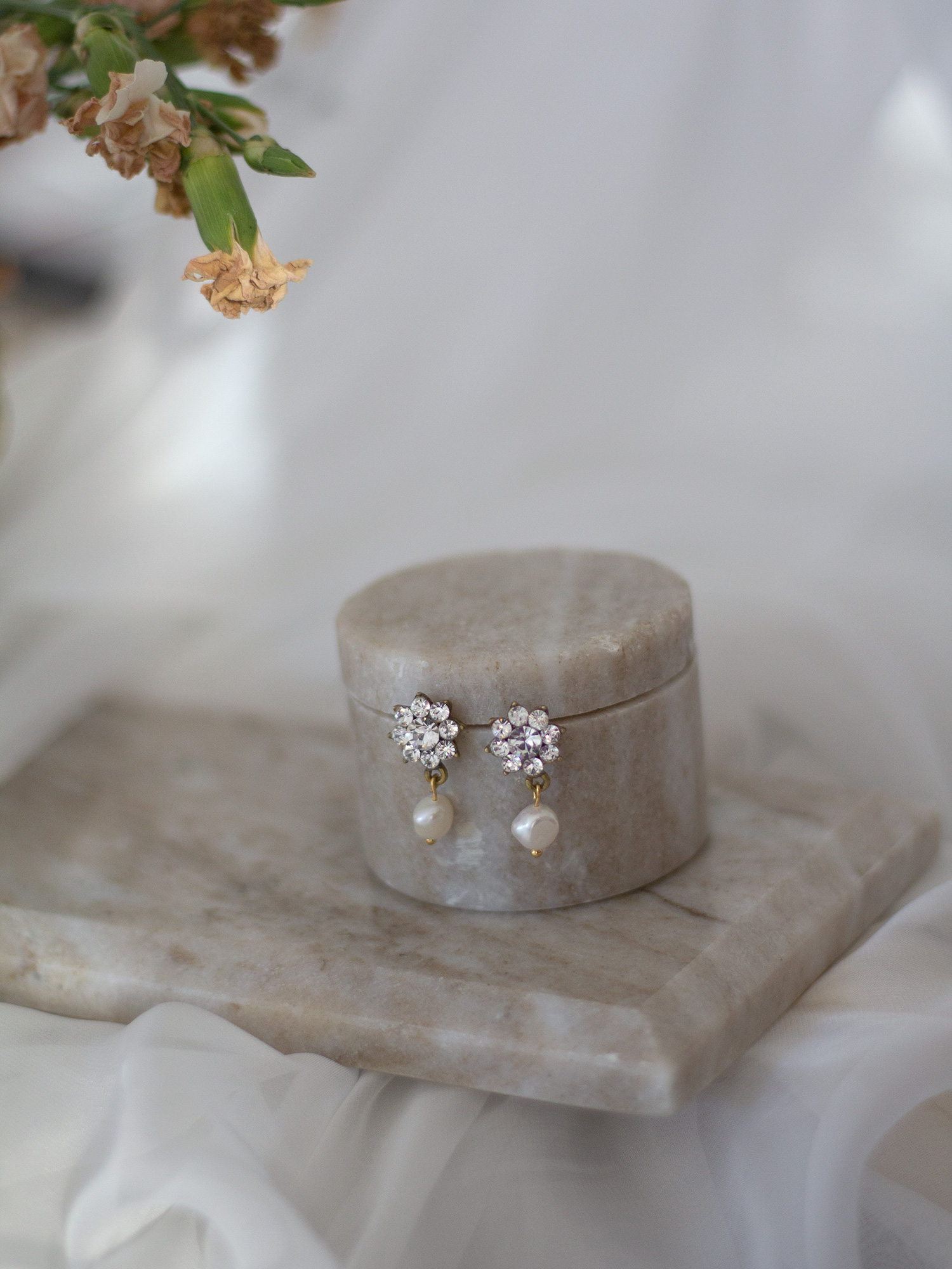 La base tiene forma de pequeña flor con cristales y lleva una perla colgando. El cristal central de la flor puede ir en el color que quieras, en las fotos puedes verlos en cristal y la opción en olor vino. Puedes escribirnos para consultar los colores disponibles.