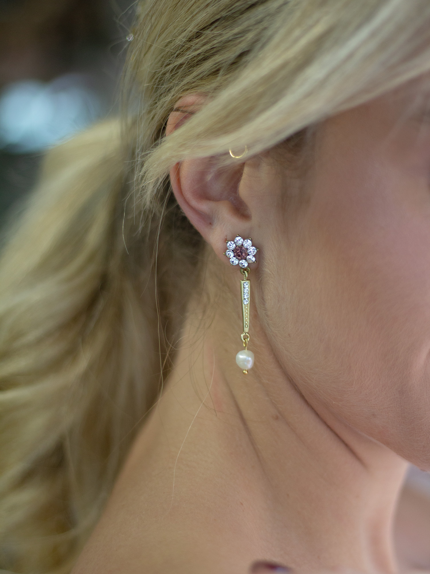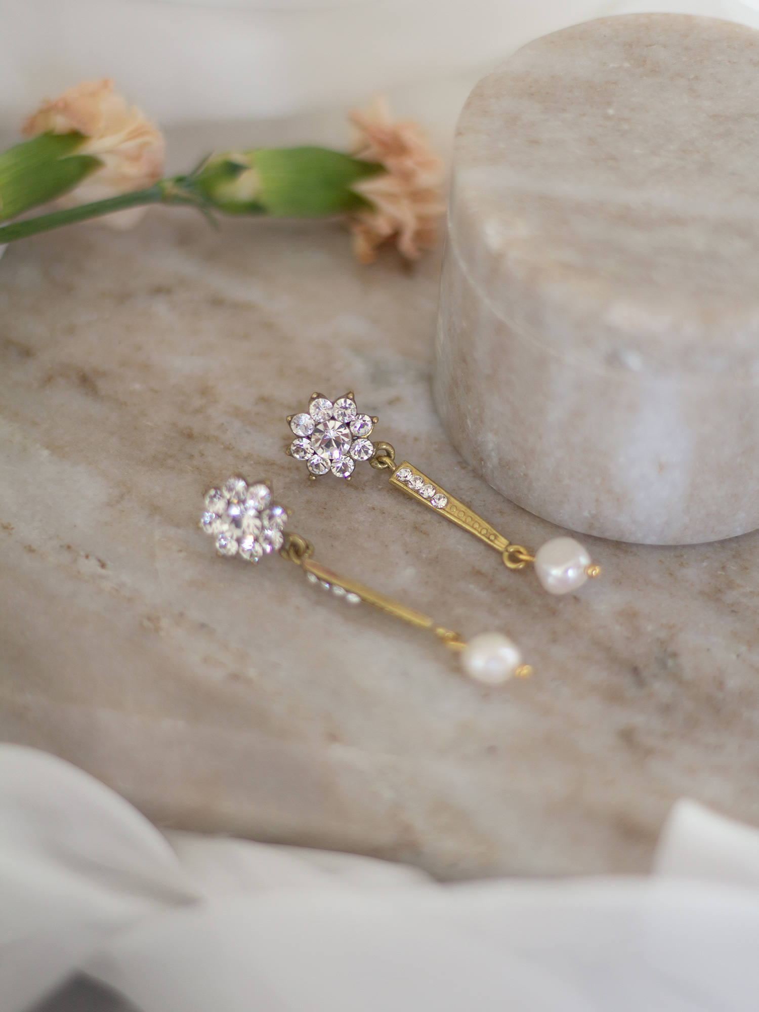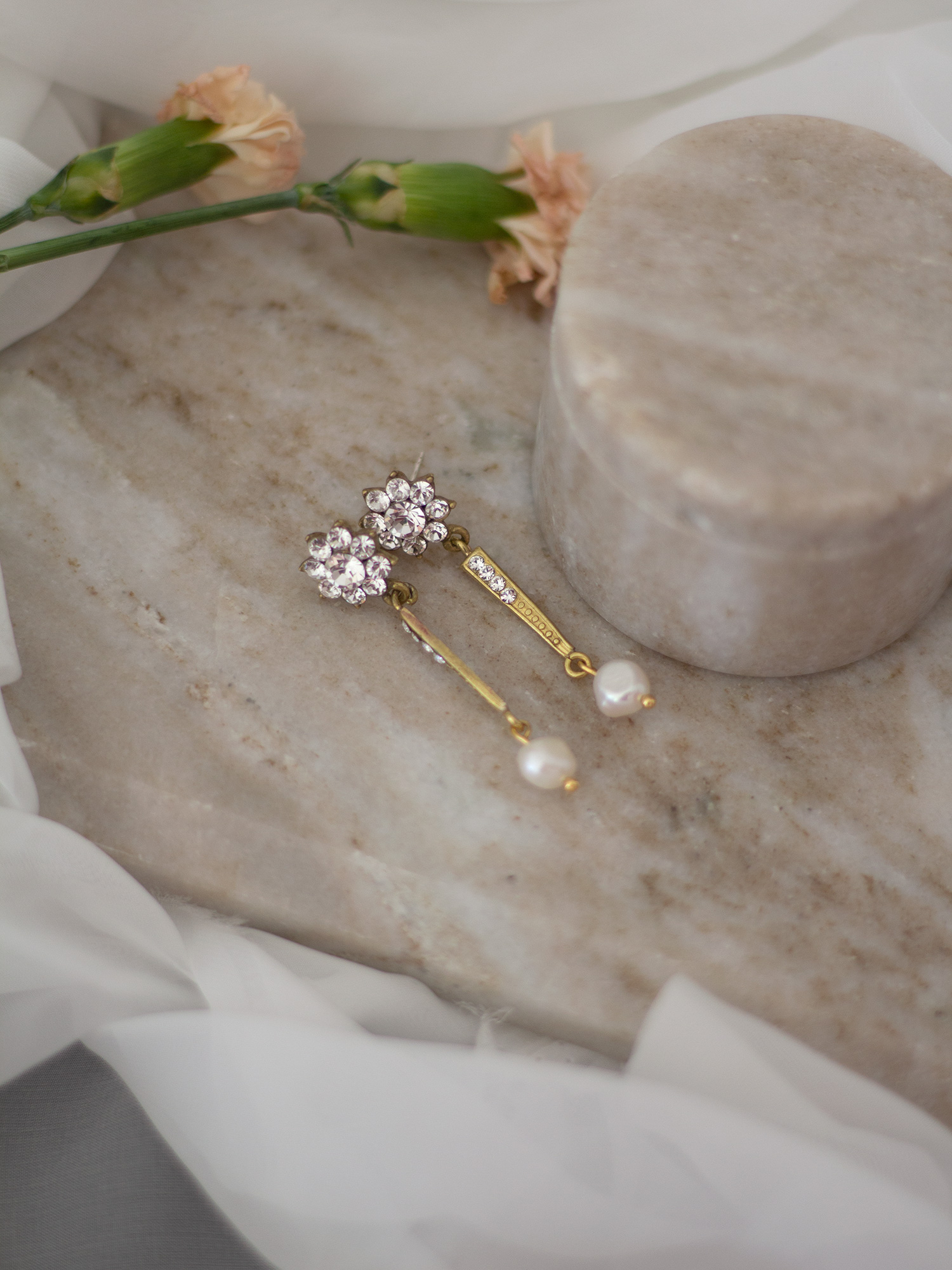 Si quieres un pendiente elegante y largo, los Orosei largos son una gran opción para tu boda. Una base en forma de flor con cristales y una parte larga con 4 cristales, con una perla asimétrica rematando.