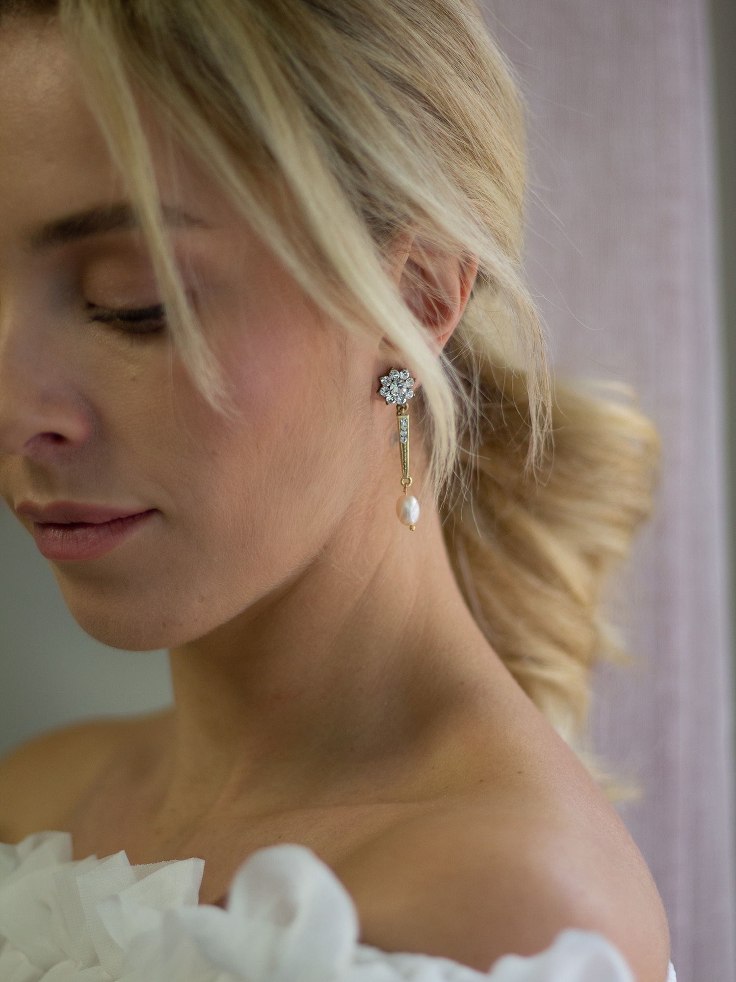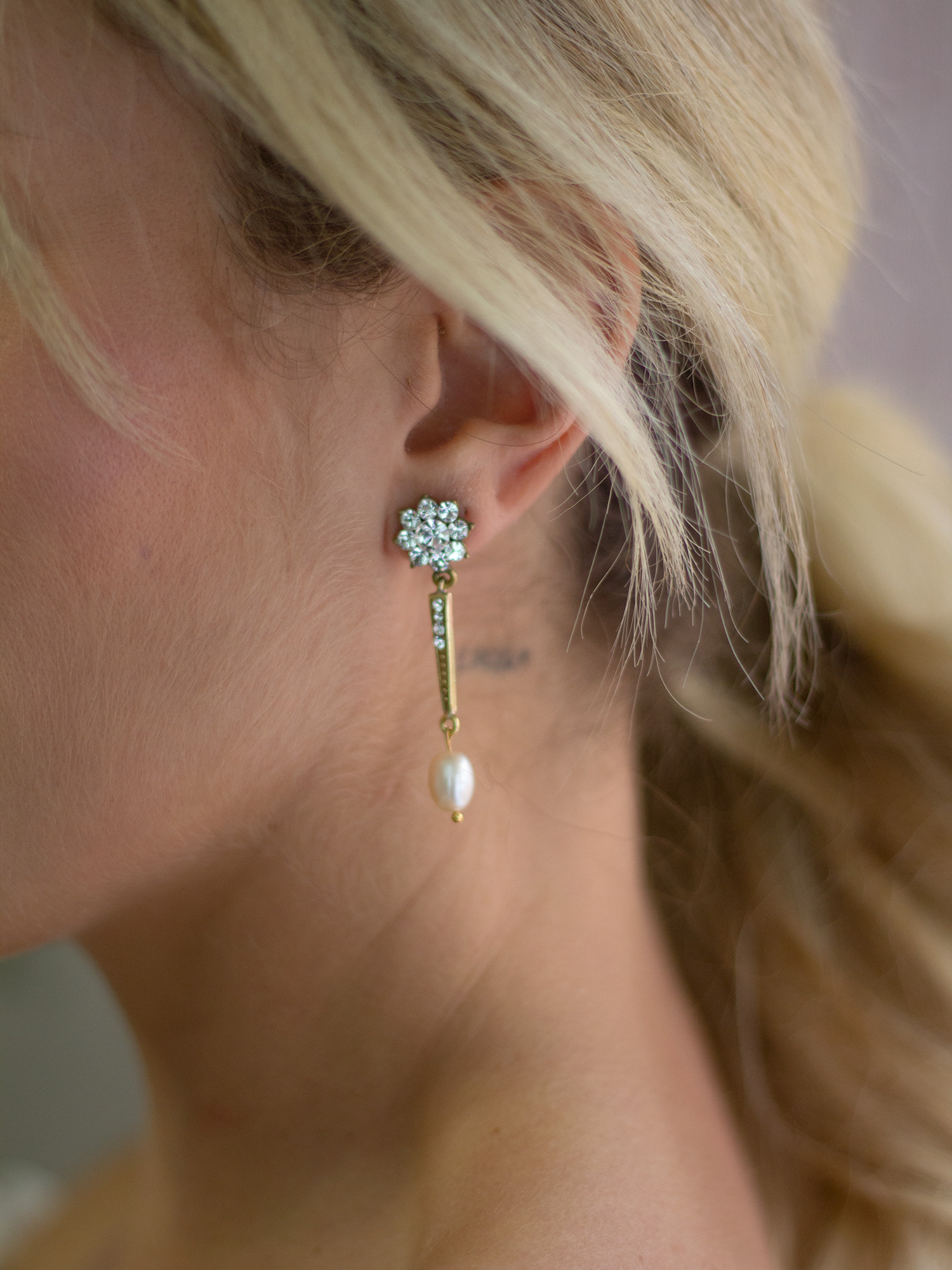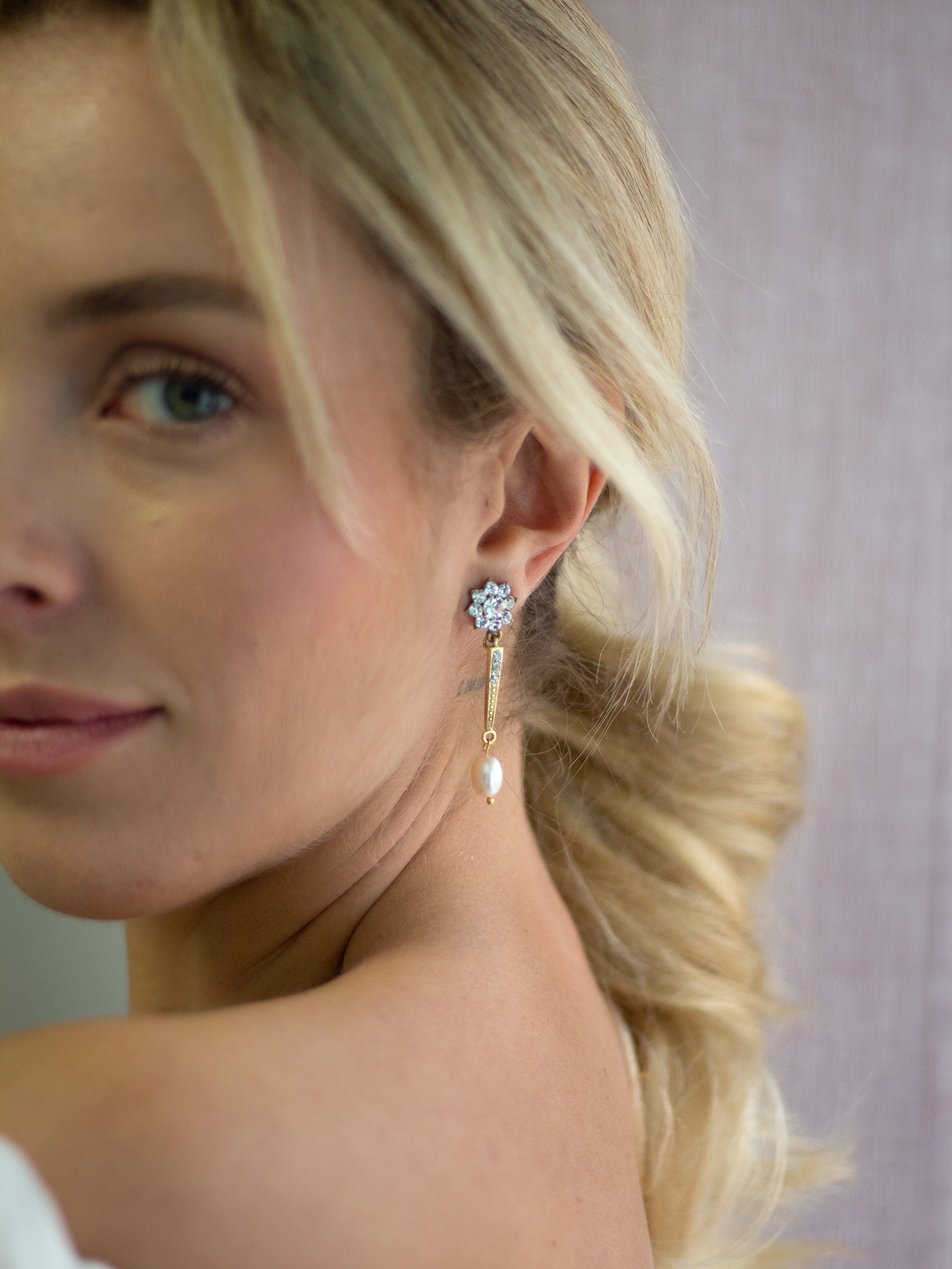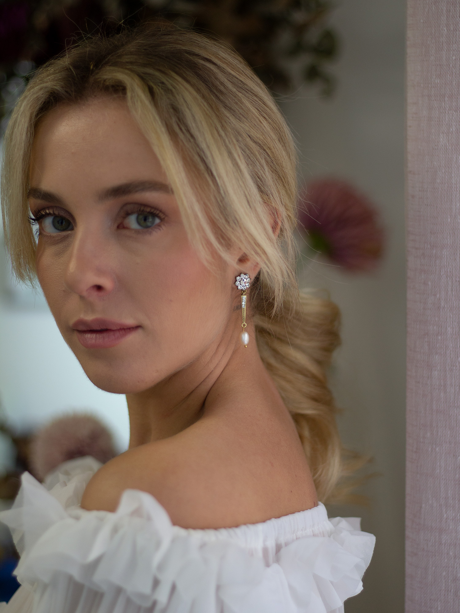 Si quieres un pendiente elegante y largo, los Orosei largos son una gran opción para tu boda. Una base en forma de flor con cristales y una parte larga con 4 cristales, con una perla asimétrica rematando.