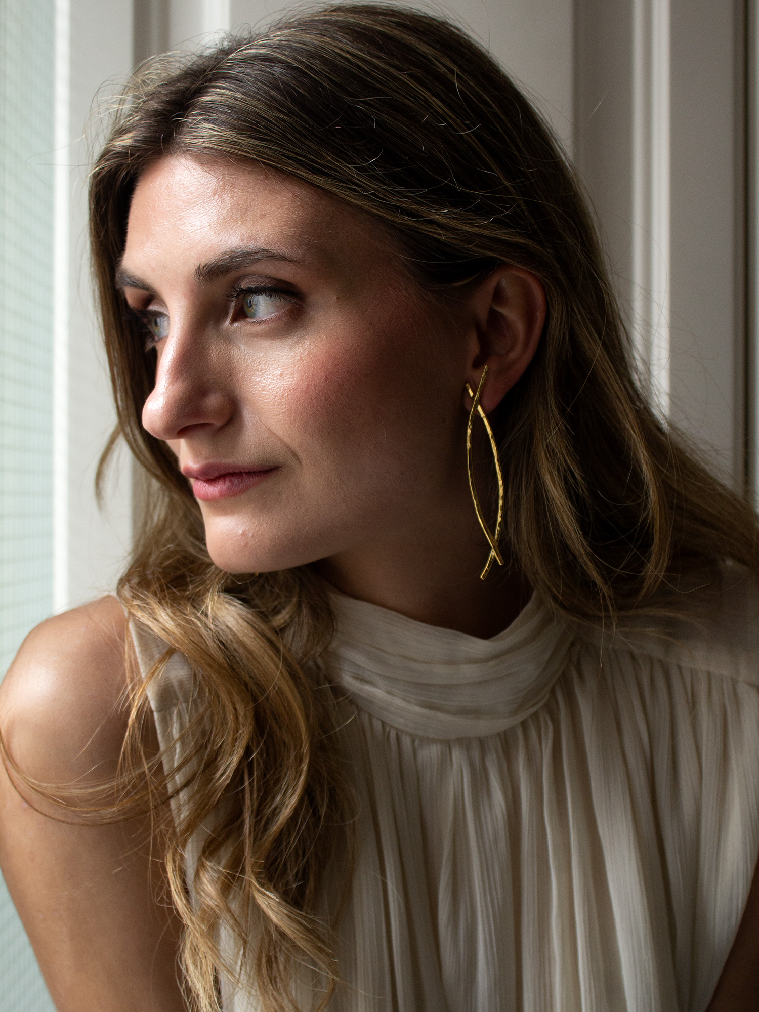 Los Pendientes Portonovo son una oda a la línea pura y al minimalismo con alma. Sus hilos de latón texturizado se cruzan con una elegancia arquitectónica, creando un diseño que fluye con el movimiento y captura la luz de forma irregular y orgánica. Son piezas que no necesitan artificios para destacar; su fuerza reside en la sencillez del trazo y en la huella visible del trabajo manual realizado en nuestro taller de Oviedo.