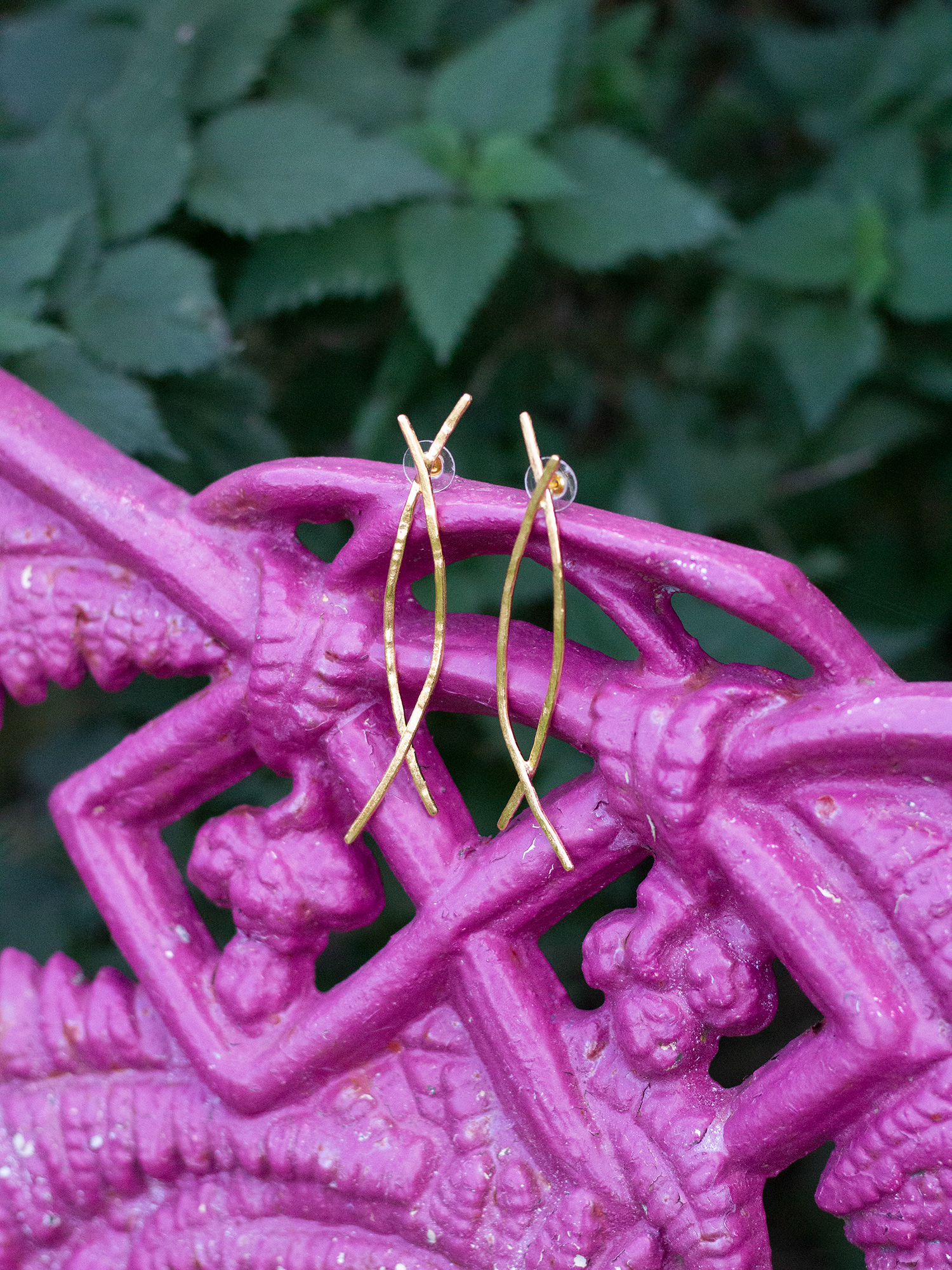 Pendientes de hilo de latón texturizado, dos líneas cruzadas con un largo de 8 centímetros en un diseño minimalista y único.