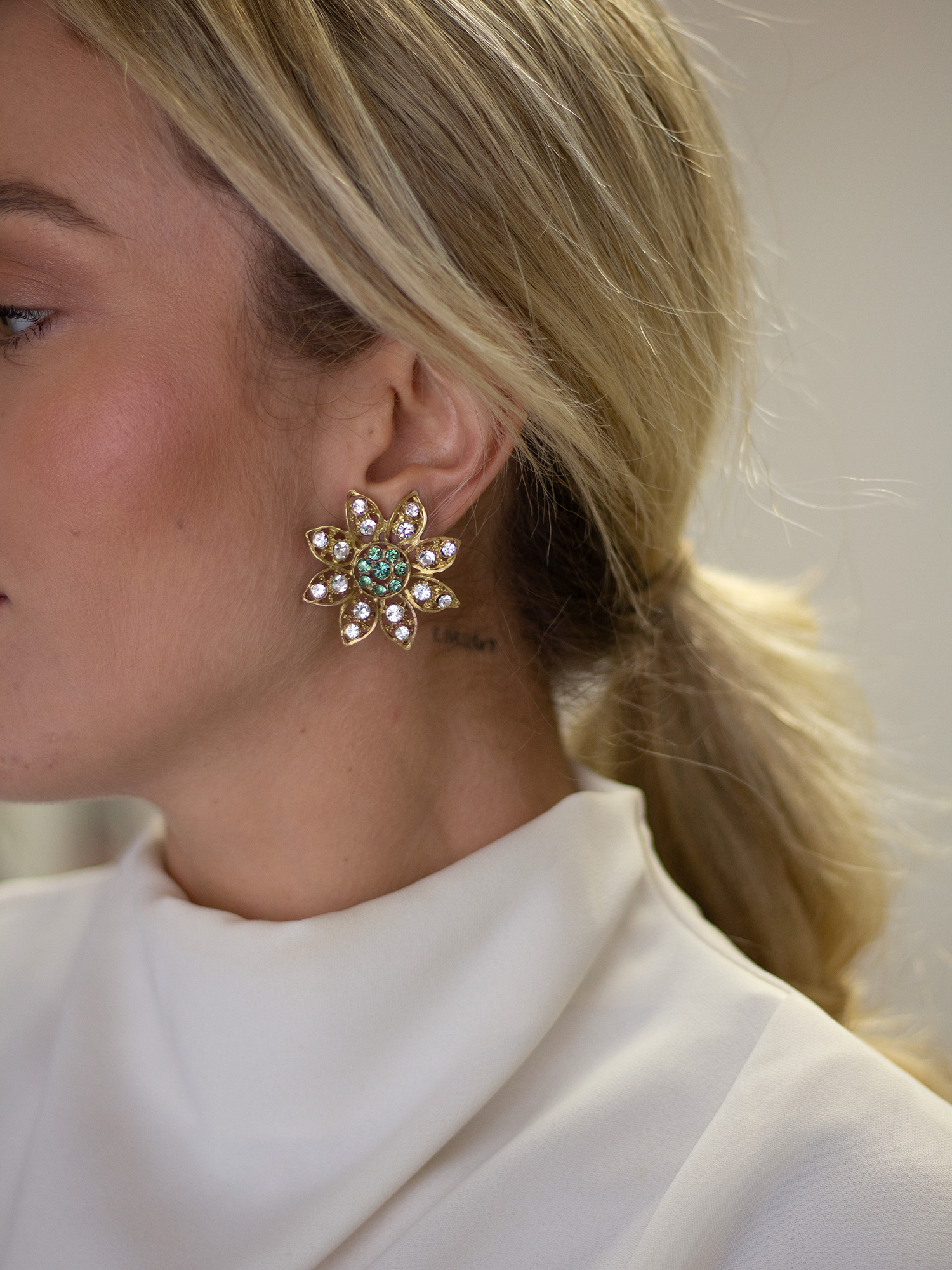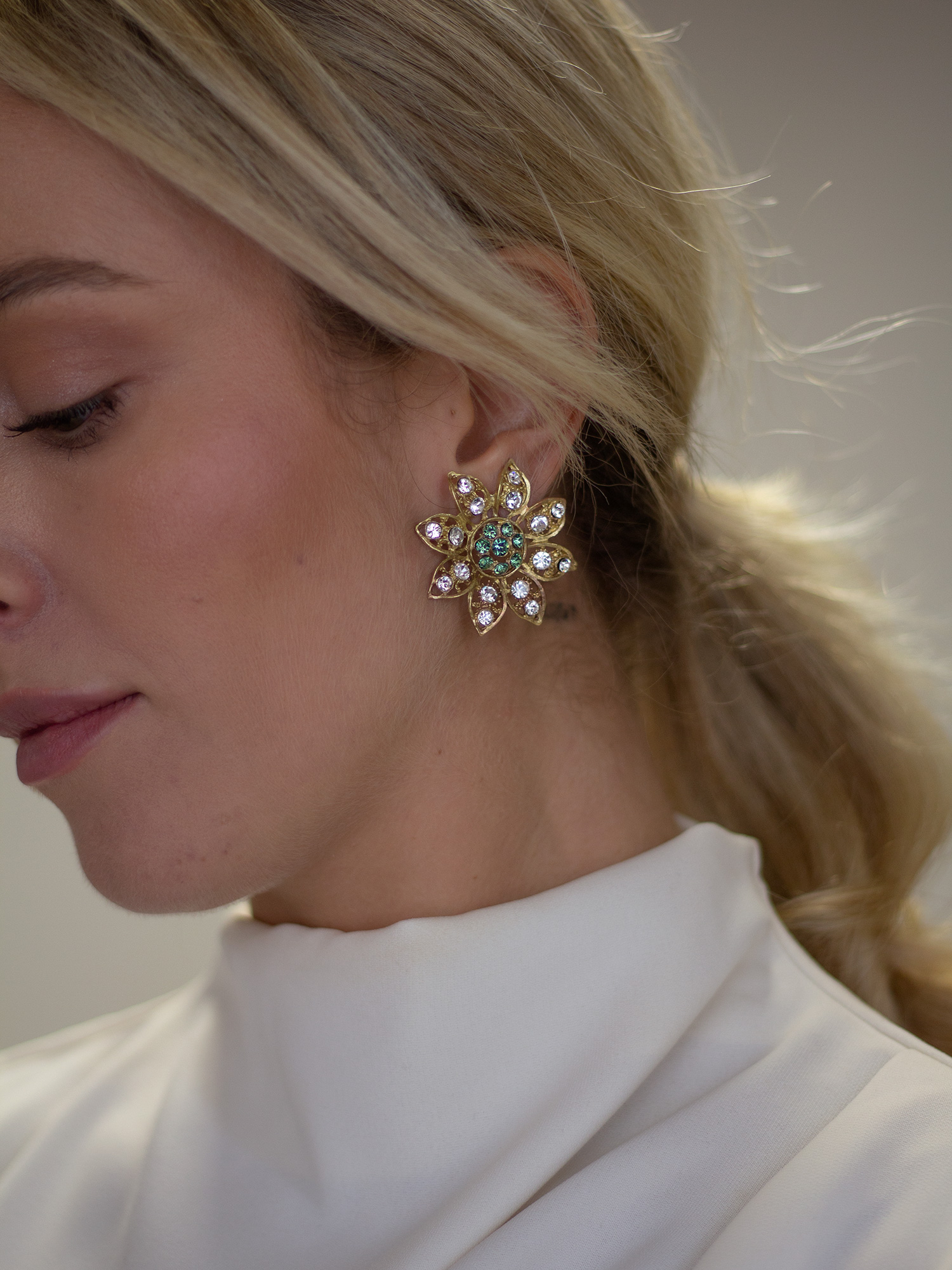 Pendientes con forma de flor, de latón, con palillo de plata y baño en oro de 18k. Cada flor lleva un total de 22 cristales. Puedes elegir de qué color quieres el centro, para que vaya juego con vestido si eres madrina o invitada de boda, o a juego con tus zapatos u otro complemento, si eres la novia.