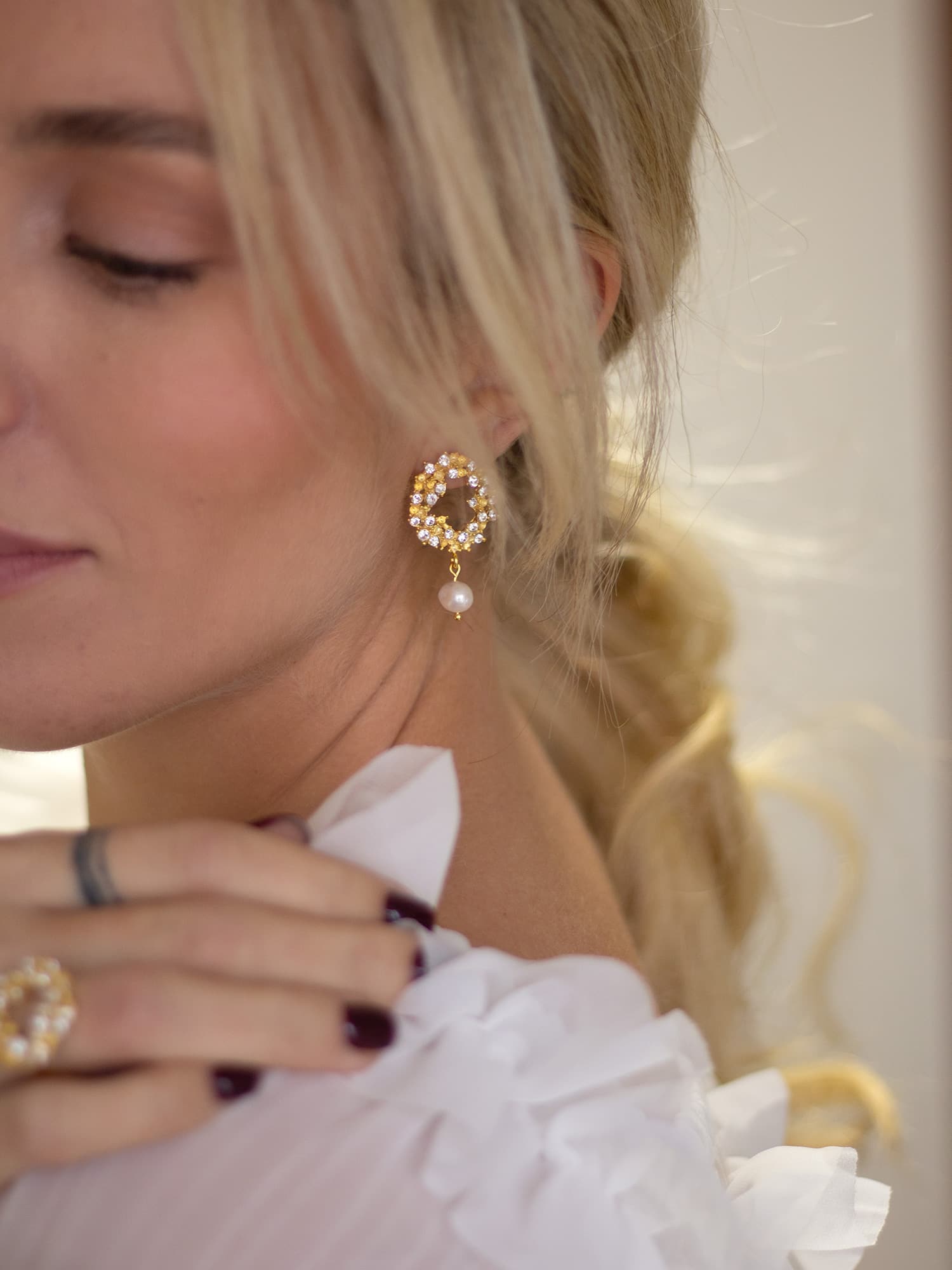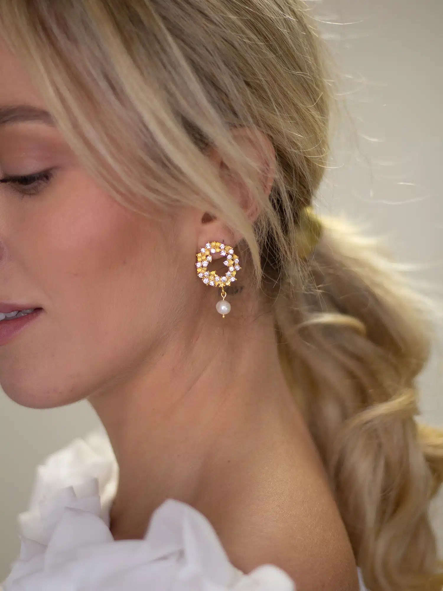 Los pendientes Windsor tienen forma de círculo irregular, perfectos para novias que busquen un pendiente de tamaño mediano y con personalidad. Llevan un perla colgando, que podemos cambiar por otro tipo de piedra si prefieres o también podemos hacerlos sin nada colgando.