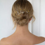 Tocado envolvente, con forma de semicírculo, pensado para usar alrededor de un moño o coleta. Lleva ramas de latón hacia el exterior y la base está adornada con perlas y cristales.