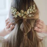Una vez acabada la pieza, le colocamos las peinetas en los laterales para su perfecta sujeción. Esto es así, y no en el centro, para que no se solape con la peineta del velo, en caso de que quieres llevarlo para la ceremonia.