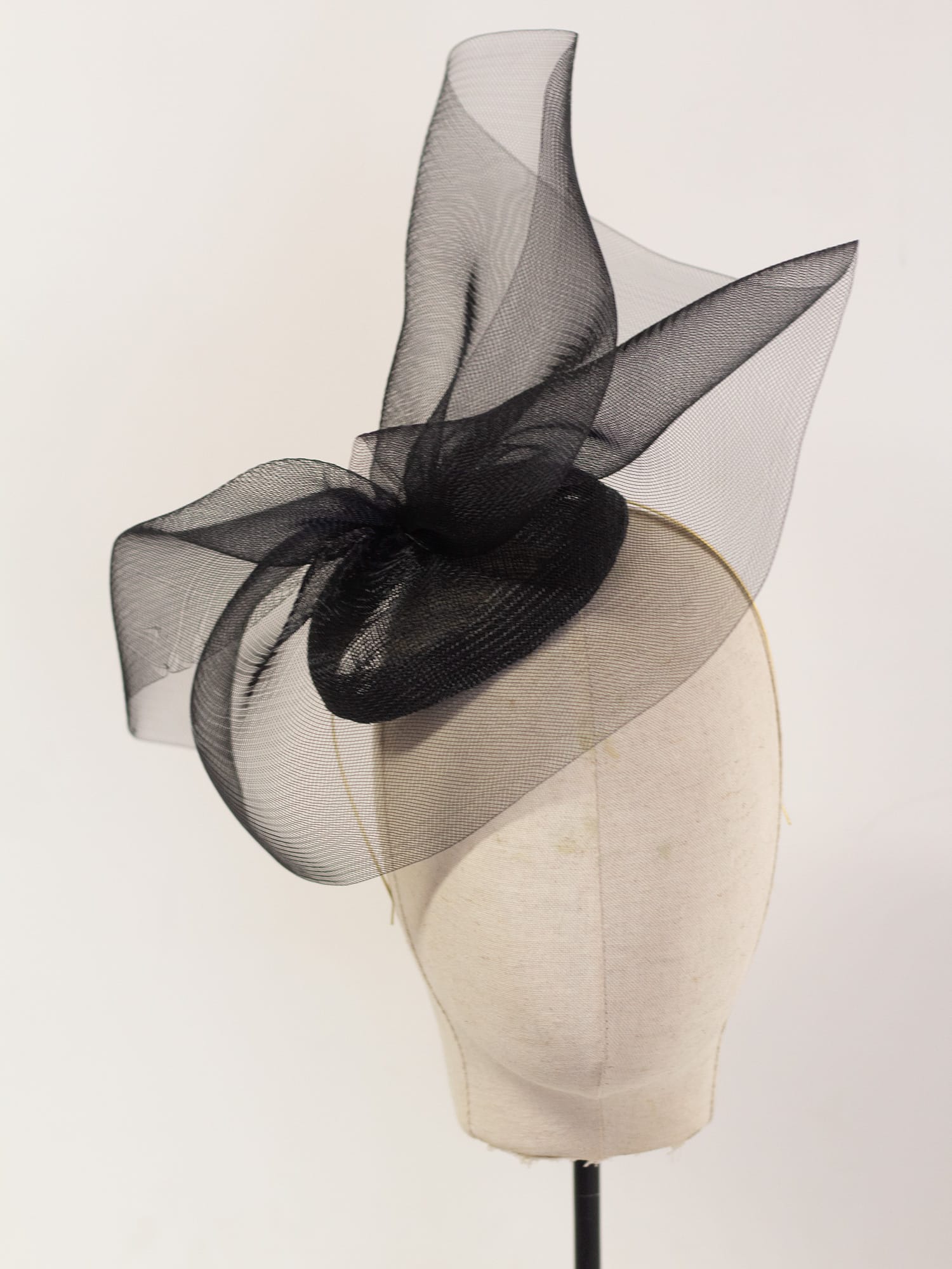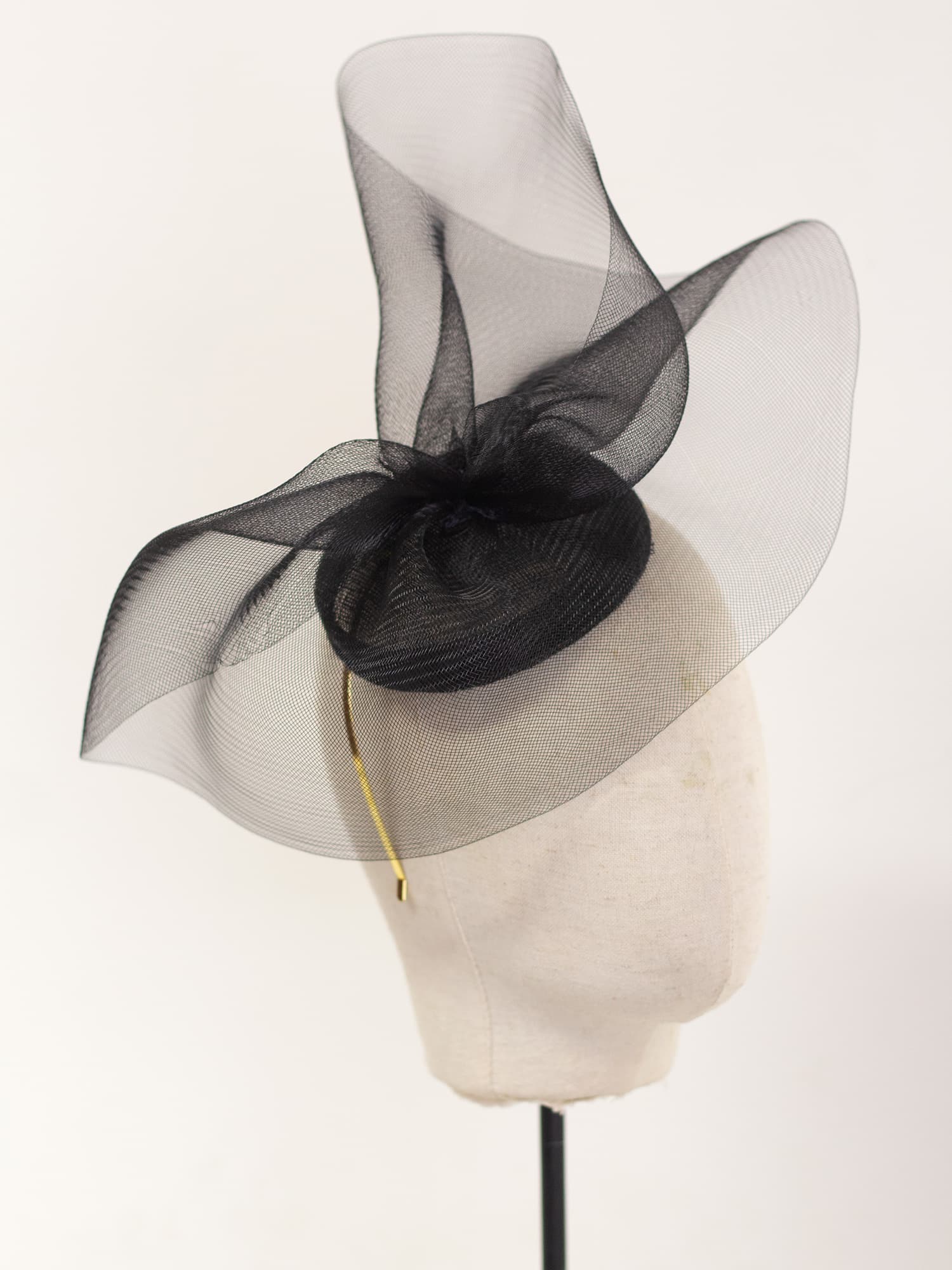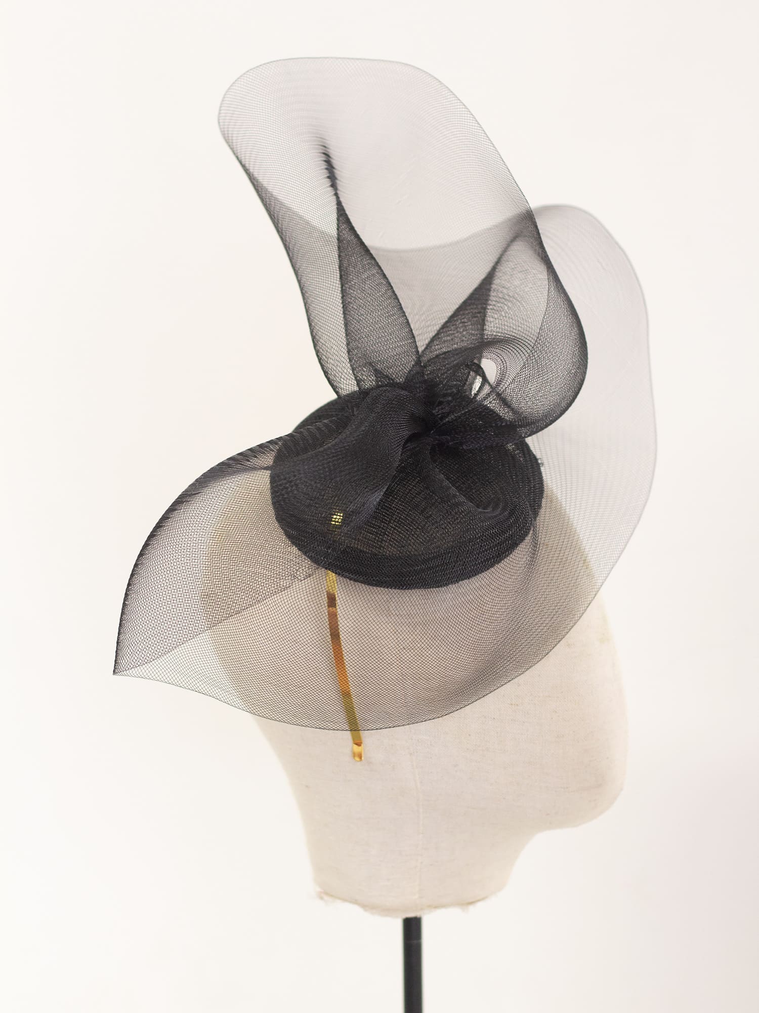 Cuenta con una base circular de sinamay en color negro, que sirve como punto de apoyo sobre la cabeza. El tejido de crin está dispuesto en bucles arquitectónicos que se elevan de forma asimétrica, creando una silueta que no resulta pesada visualmente gracias a su transparencia.