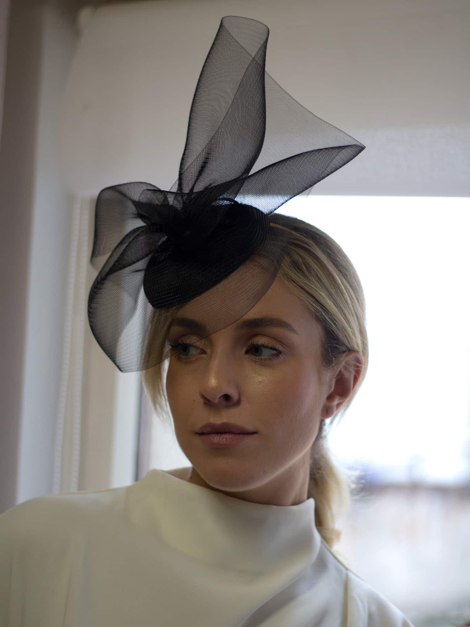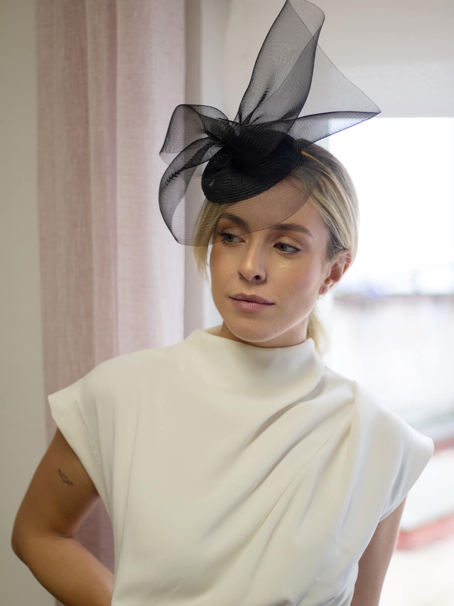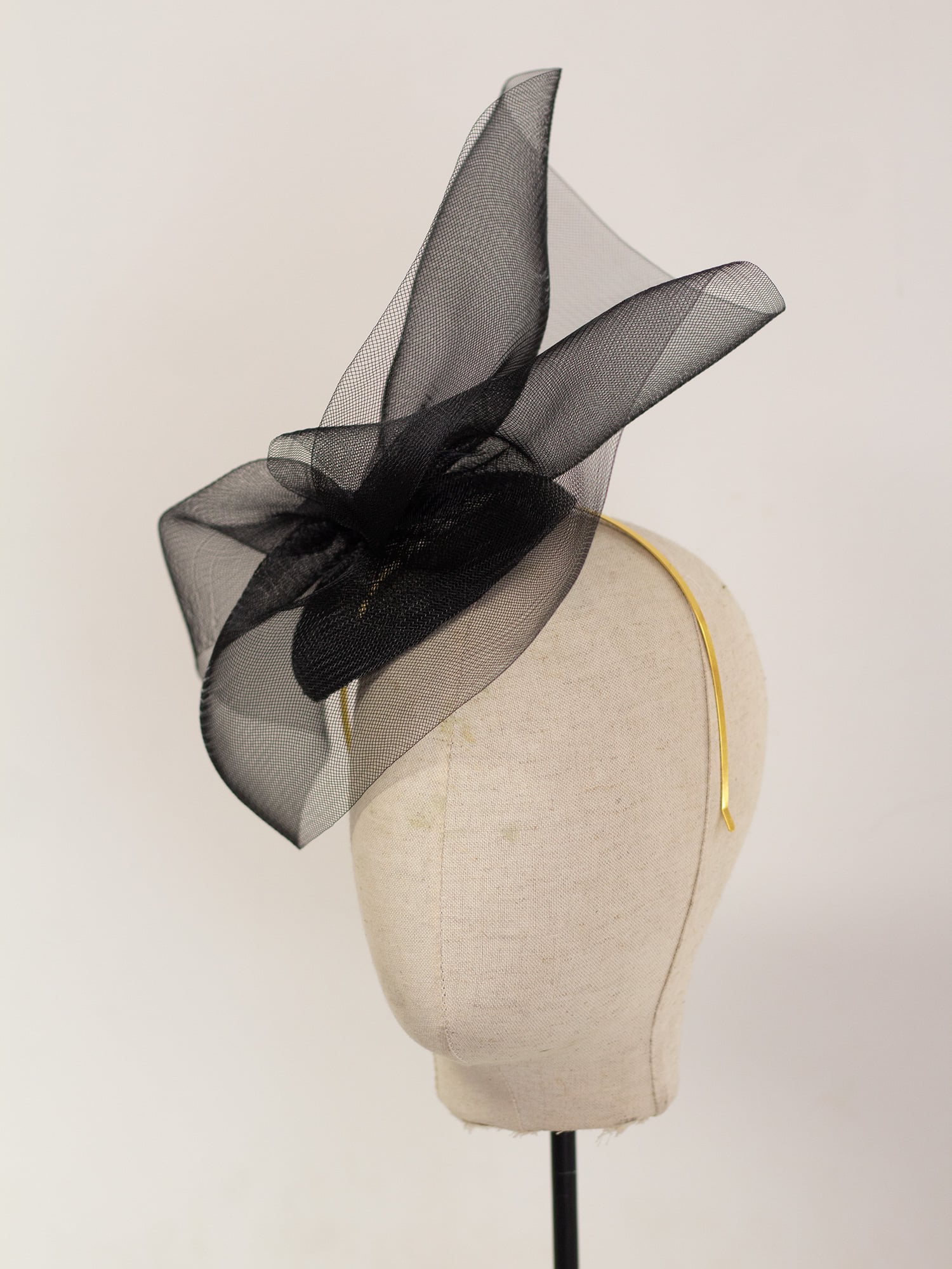Cuenta con una base circular de sinamay en color negro, que sirve como punto de apoyo sobre la cabeza. El tejido de crin está dispuesto en bucles arquitectónicos que se elevan de forma asimétrica, creando una silueta que no resulta pesada visualmente gracias a su transparencia.