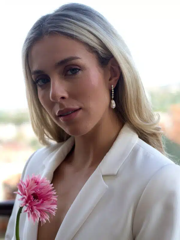 Pendientes con base alargada, de latón con baño en oro de 18k, con 6 cristales y rematados con una perla grande.