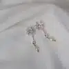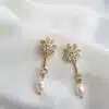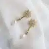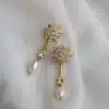 Estos pendientes de latón puro con baño en oro de 18k, son los pendientes perfectos para tu gran día. La flor principal tiene un diámetro de 1,5 cm y 17 cristales. De ella sale un alargador con un cristal abajo, con una perla colgando.