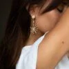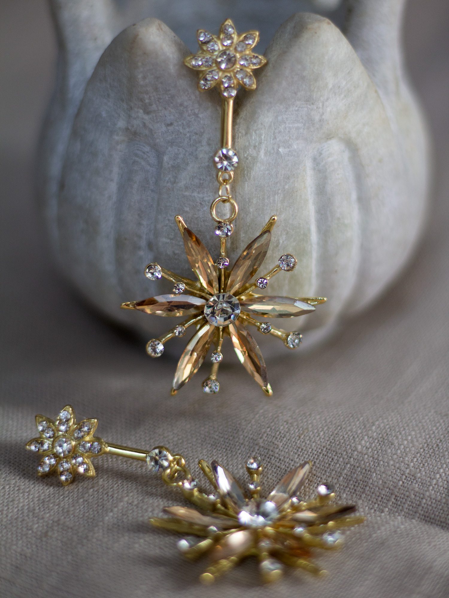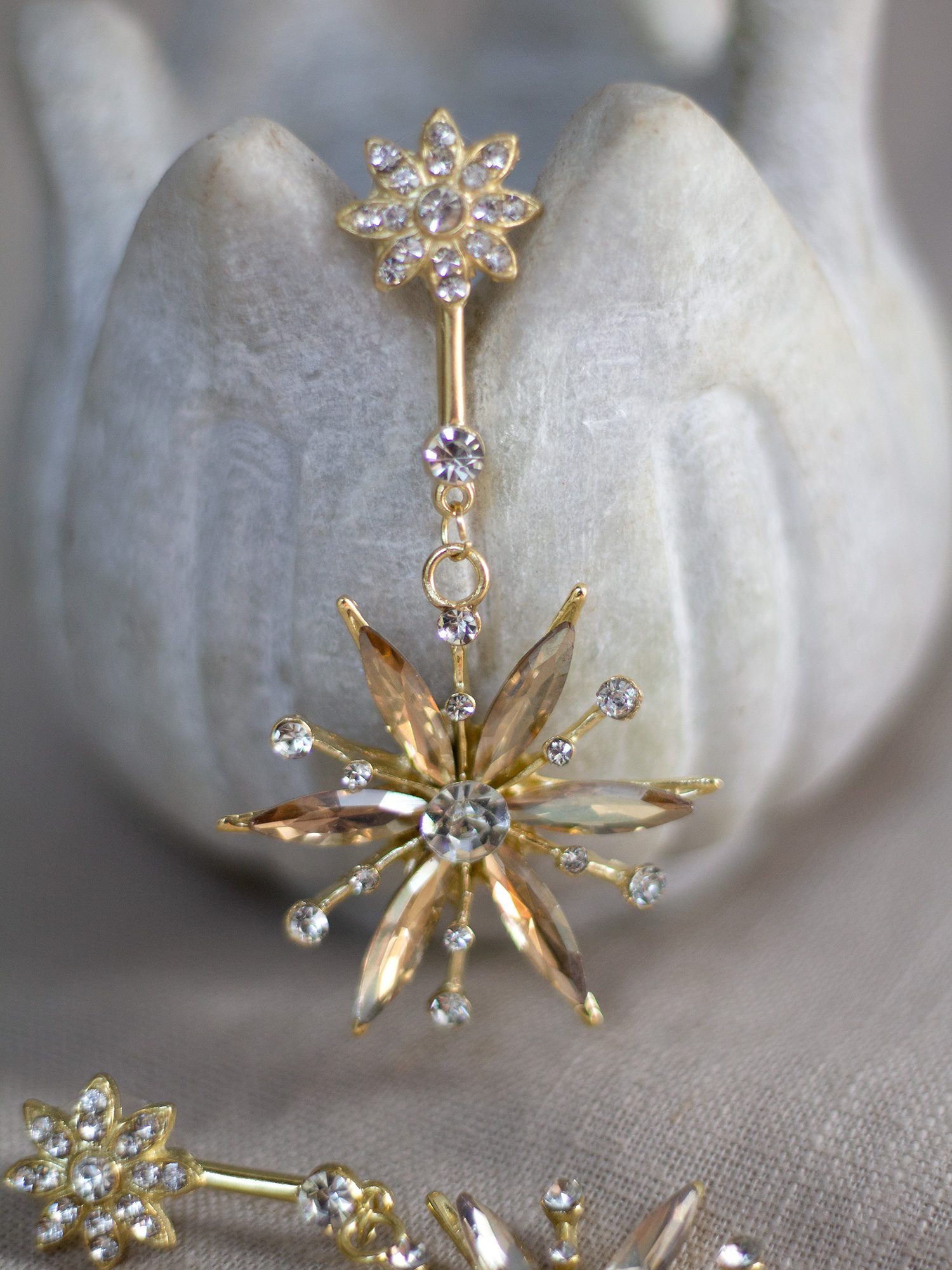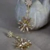 Pendientes largos de estrellas. La base es una estrella pequeña con cristales, unida a una estrella grande por un alargados con cristal.